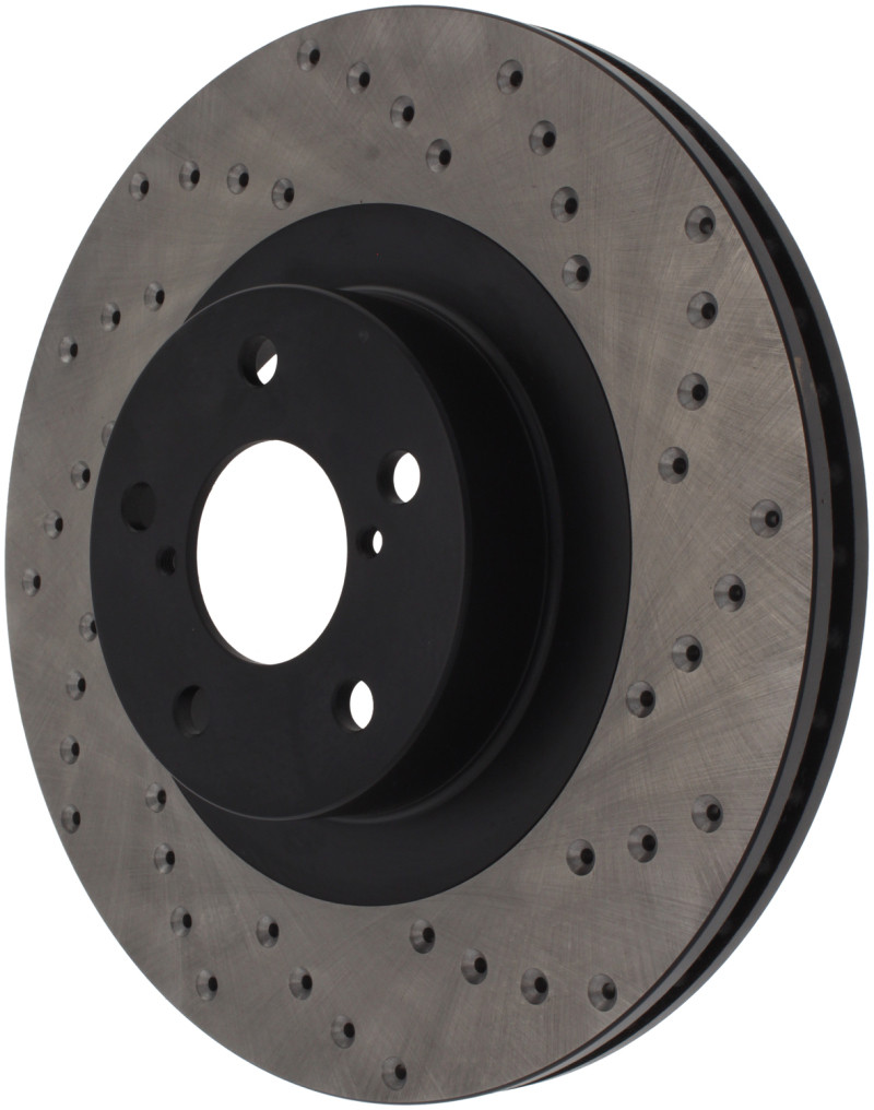 StopTech Drilled Sport Rotors are 1-piece direct replacement brake discs for factory brake systems and stock calipers that look great behind your wheels – and offer significantly improved braking performance. The unique cross-drilling aids with heat and brake dust dispersal, prevents glazing of the pads, adds bite and improves wet and dry braking performance. Built to last, the black e-coating provides protection from corrosion and the high carbon metallurgy (in most applications) offers quieter operation, better crack resistance and increased performance.