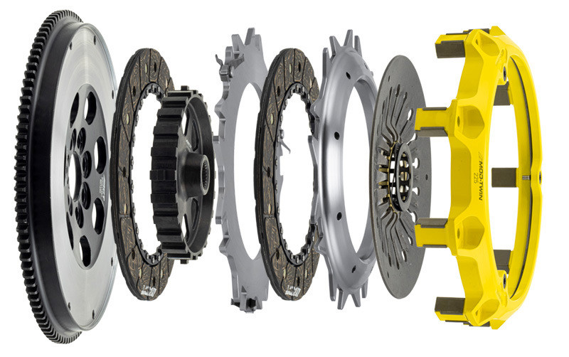 T2S-M07 Mod-Twin 225 XT Rigid Street Kit blends easy pedal feel, smooth but positive engagement with quick shifting for high powered AWDs by combining twice the organic friction surfaces with a no-nonsense rigid Mono-Drive hub in a completely modular design. Each diaphragm spring endures an exclusive four-stage heat treating process. Steel-backed Friction Plates with high quality organic friction materials deliver stable friction coefficient, good heat capacity and long clutch life. These Friction Plates uniformly transfer torque to a Mono-Drive chrome-moly hub which is heat treated for strength and durability extending input shaft life with one continuous spline. The lightweight, rigid design allows for quicker shifts and trouble-free service. This kit includes a CNC-machined and dynamically balanced flywheel, pressure plate cover, diaphragm spring, face, puck-style ceramic friction plates, rigid Mono-Drive hub, floater, patented Monoloc Collar, release bearing, alignment tool and pilot bearing (if needed). Mod-Twin clutches are fully rebuildable and most components can be ordered separately.
